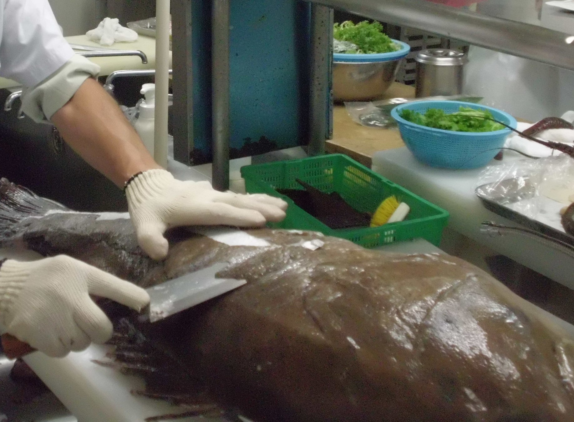 そんな中でも、休暇村ではクエ料理を始めて30年以上、「天然」をご提供しています。クエは大きければ大きい程身がしまり、脂がのり旨みが増す魚と言われています。休暇村では約30kg(約100人前)の大型のクエを仕入れ、お客様により美味しいクエをお召し上がりいただこうと天然物にこだわってご提供しています。