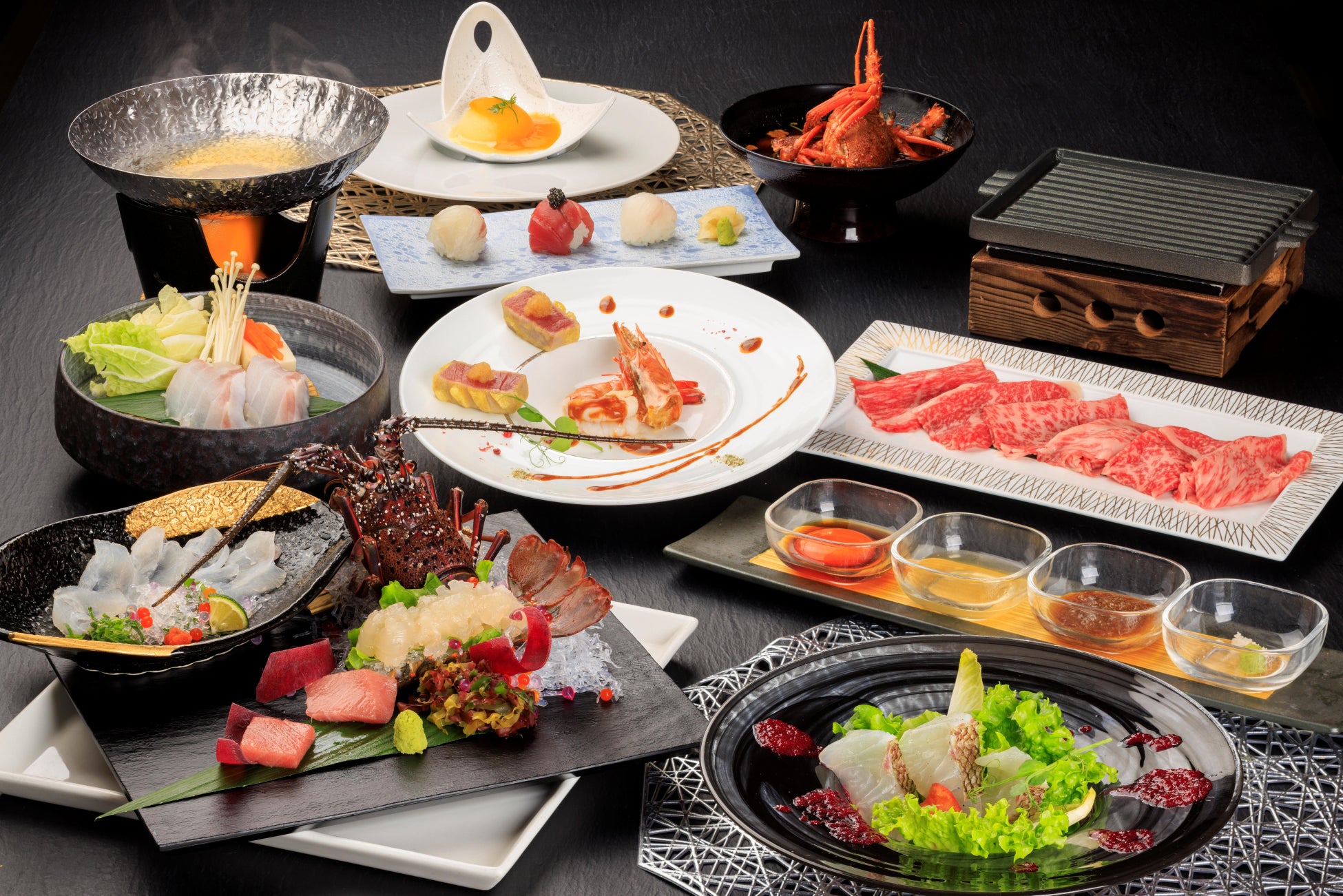 前菜:鯛炙りサラダビーツソース掛け / 造り:伊勢海老姿・天然クエ薄造り・マグロ中トロ / 鍋物:天然クエ鍋 ~クエの骨から取った至極の出汁~ / 台物:熊野牛サーロイン焼きシャブ~5種類の特製タレを付けて / 洋皿:和歌山県産足赤海老酒蒸し・マグロ中トロフリッターレア仕立て / 食事:天然クエ・マグロ中トロ・鯛手まり寿司の近大キャビアのせ / 汁物:伊勢海老の赤出汁 / デザート:柚子シャーベット有田みかんソース掛け