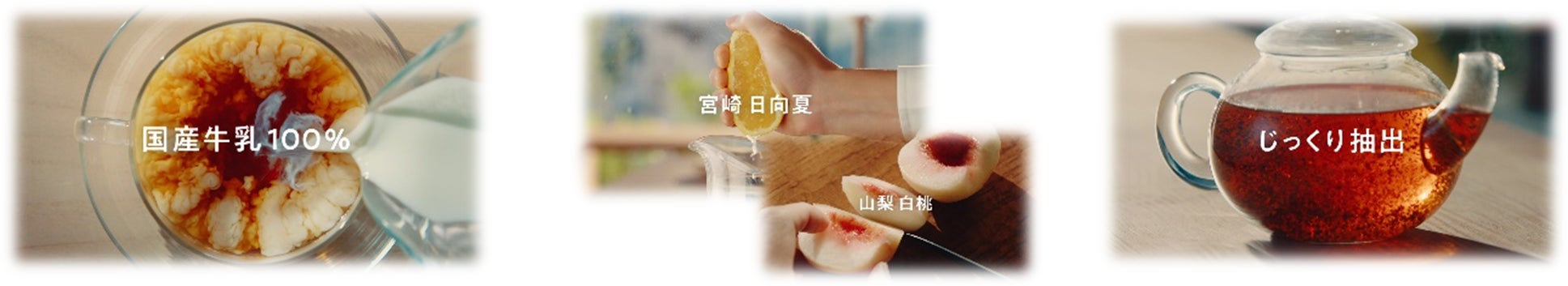 「紅茶花伝」は、茶葉、ミルク、果汁などの厳選素材とその素材の味わいを最大に引き出すために納得いくまでブレンドや淹れ方に試行錯誤を重ねた自信作です。ミルクは国産牛乳100%※2にこだわり、果汁にはおいしいところだけを搾った100%果汁をたっぷり使用※3しています。茶葉は厳しい独自規格を満たした農園の厳選手摘み茶葉のみを使用し、「紅茶花伝」こだわりのティーポットで淹れ紅茶のようにじっくり抽出し、紅茶本来の香りや味わいをお楽しみいただけます。