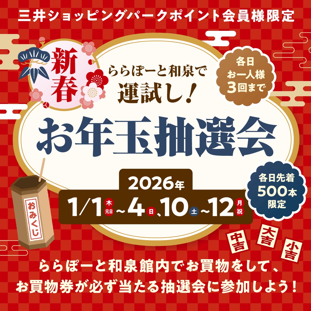 ハズレなし!各日先着500本限定!ららぽーと和泉限定で使える『三井ショッピングパークカード《セゾン》クレジット支払い限定お買物券』が当たるお年玉抽選会を開催します。三井ショッピングパークアプリ内「メンバーズページご登録」と、ららぽーと和泉館内での当日お買上げレシートをご提示で、3,000円(税込・合算可)ごとにご参加いただけます。