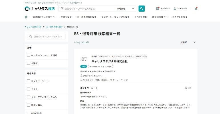 先輩たちが実際に体験した選考の内容やESのほか、就活生が気を付けるべき点などの就活アドバイスを会員限定で公開しています。約25,000件(※)のクチコミ(ES・選考対策・体験談を含む)を掲載し、学生の就活に役立つ情報を提供しています。