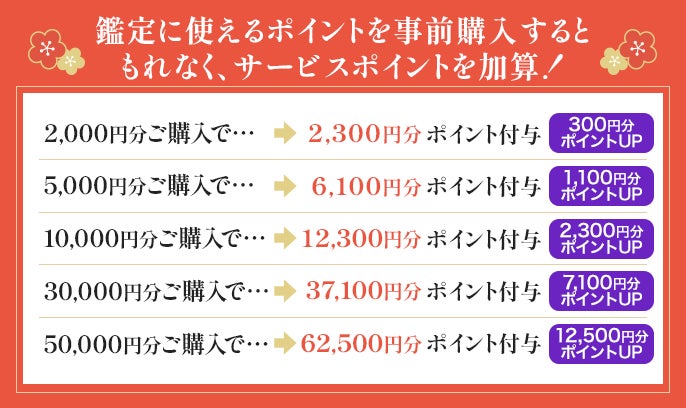 キャンペーン期間中に、鑑定に使用するポイントを事前に購入いただいた方に購入金額に応じてポイントを付与いたします。