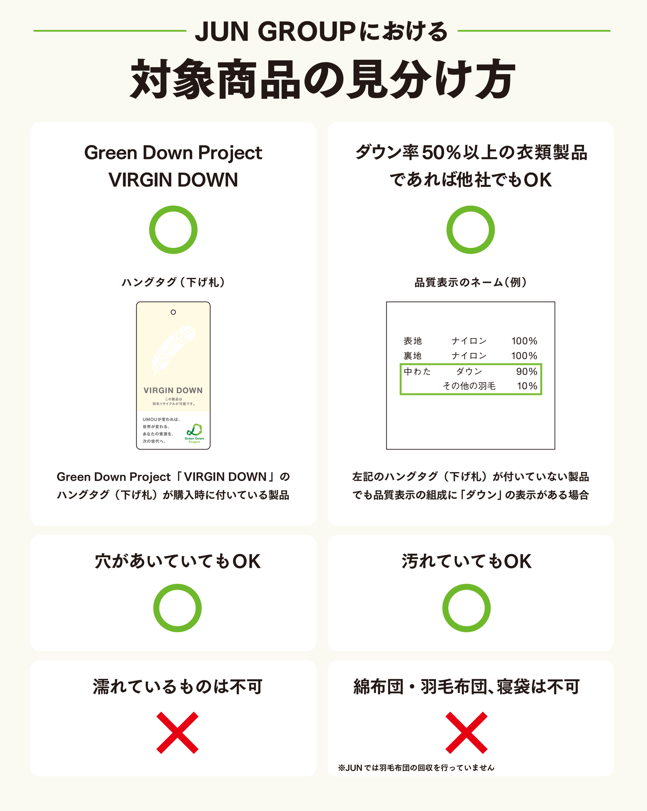 ・Green Down Project 「 VIRGIN DOWN 」のハングタグが購入時に付いている商品。