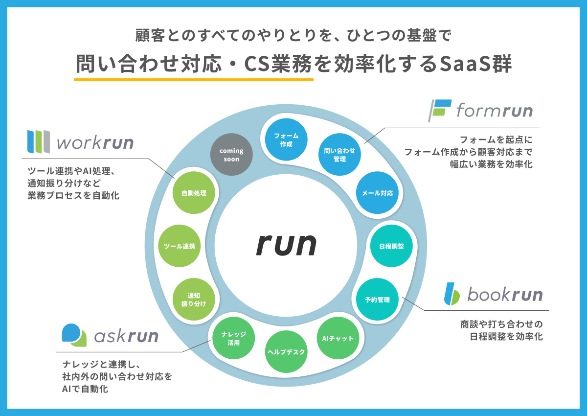 run Suite構想は、当社のプロダクト開発経験とAI駆動開発を掛け合わせ、フロントオフィス領域の効率化・省力化を支える新たなSaaS群を継続的に展開していく取り組みです。今後も、安心・安全・確実に使えるプロダクトを通じて、お客様の事業成長に貢献してまいります