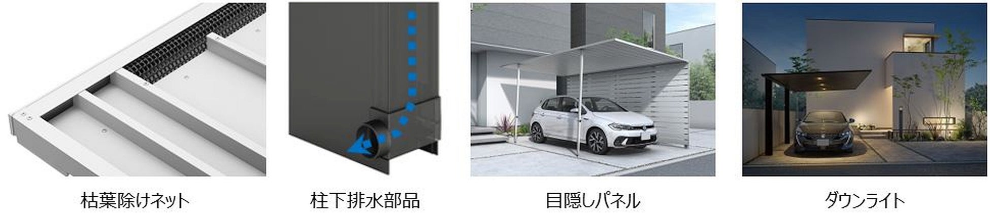 また、高いデザイン性はそのままにプライバシーを守る「目隠しパネル」、乗降時の安全性や夜の車庫空間を美しく演出する「ダウンライト」など、プラスアルファのオプションで機能性がさらに向上します。