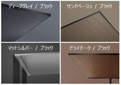 「屋根材部分」(※2) アルミ色:ブラック、ピュアシルバー、プラチナステン アルミ色(ブラスト仕上げ):マットシルバー 単色(エンボス調):サンドベージュ、ディープグレイ(※3) 木調色:ナチュラルオーク、ドライチーク(※3) |