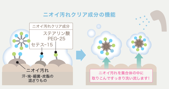 ニオイ汚れをキャッチしてすっきり洗い流します。