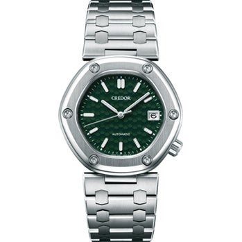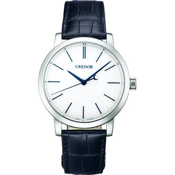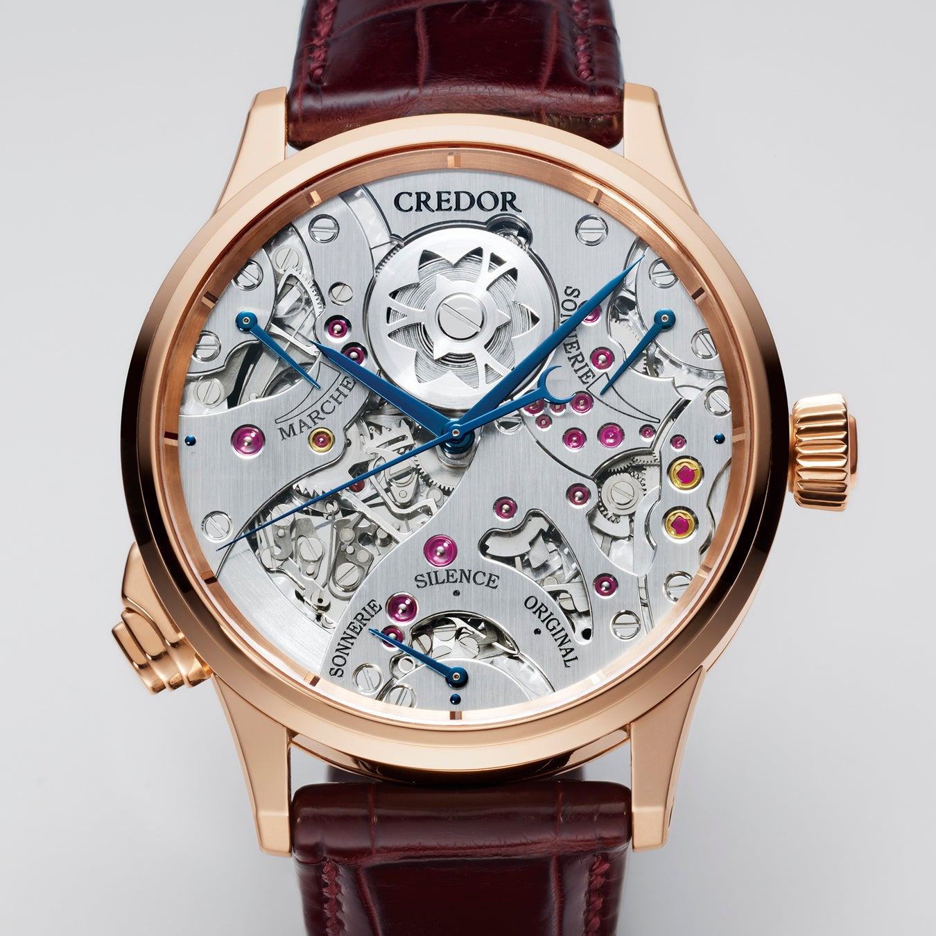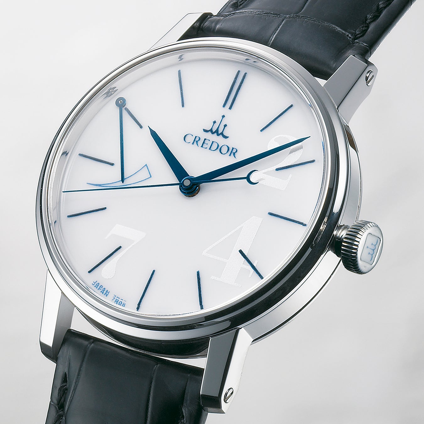 代表作の「叡智Ⅱ」は、世代を超えて受け継ぐことのできる”究極のシンプリシティ”をコンセプトに、極限まで研ぎ澄まされたモデルです。ガラス質の艶やかさと透明感をもつ磁器ダイヤルに、卓越した職人が12箇所のアワーマークとCREDORロゴを一点一点手描きしています。