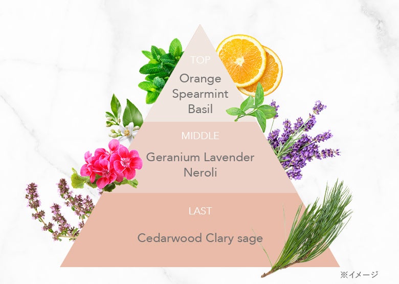 魅力的な大人の女性をイメージし、自然由来の精油によるハーバルフローラル調の香りです。フレッシュなオレンジをアクセントに、ゼラニウム・ラベンダー・ネロリのハーバルフローラルが広がり、ミントとバジルで奥行きを演出。ラストはシダーウッド・クラリセージに包まれ、穏やかなスキンケアタイムとなります。