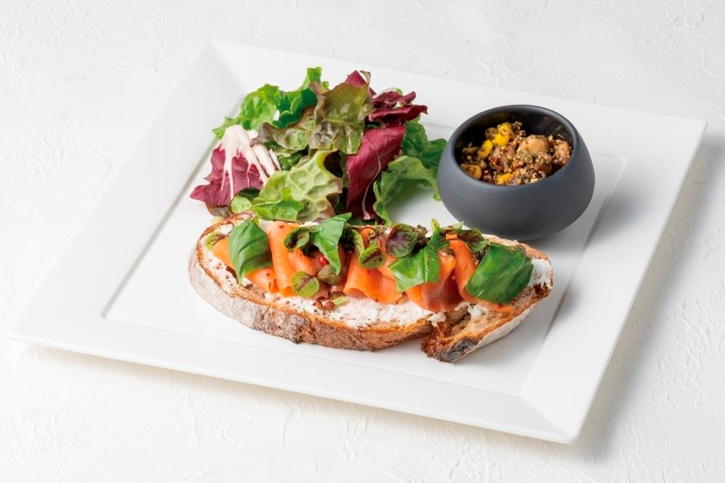 トラウトスモークサーモンとリコッタチーズに、大葉、バジル等を使ったタプナートのオープンサンド。ほのかにカカオフルーツの甘味を感じ、爽やかな中にもコクのある味わいです。