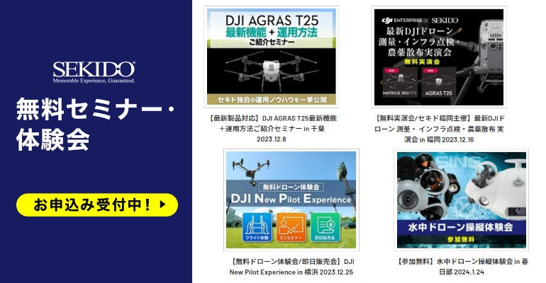 セキドでは、より多くの事業者の方にドローンを使った業務効率の改善を実現していただくため、業務用ドローンや関連ソリューションをご紹介する無料セミナーやイベントを定期的に開催しております。今後もオンラインや全国各地での開催を予定しておりますので、ご興味をお持ちのイベントにはぜひお気軽にご参加ください。