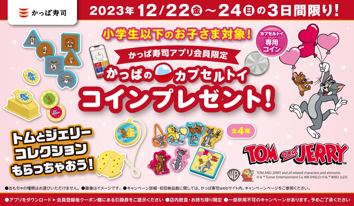 かっぱ寿司よりおこさまにクリスマスプレゼント!「トムとジェリー」コラボアイテムがもらえる 【公式アプリ会員限定】クリスマスキャンペーン「カプセルトイコイン」プレゼント