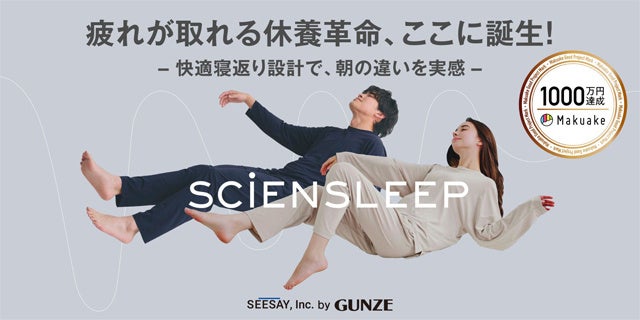 グンゼ株式会社(本社:大阪市北区、社長:佐口 敏康、以下グンゼ)の100%出資子会社である「SEESAY(シセイ)」(本社:東京都渋谷区、社長:奥田 洋一)は、応援購入サービス「Makuake(マクアケ)」での累計応援金額が1,200万円を突破した疲労軽減ウェア「SCiENSLEEP(サイエンスリープ)」の一般販売を2025年2月上旬から開始しました。