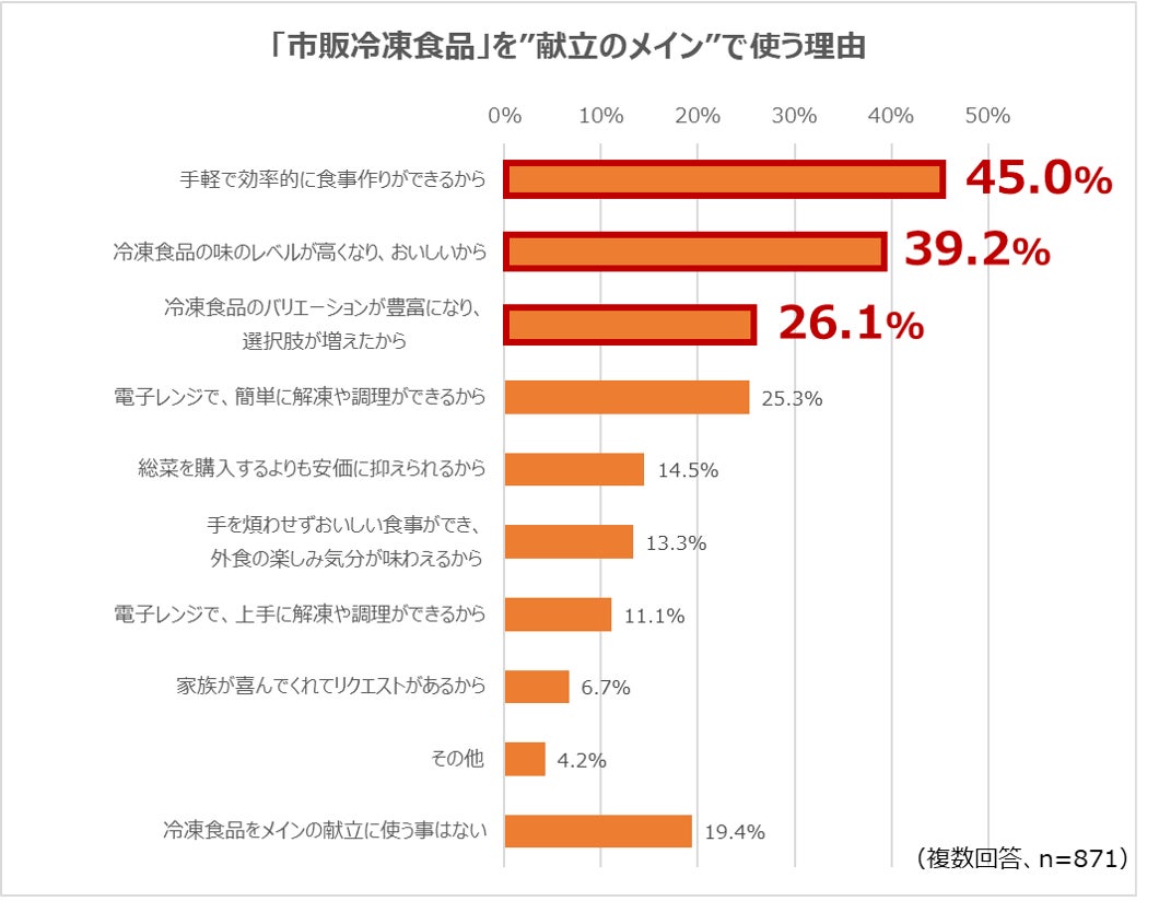 その理由は「手軽で効率的に食事作りができるから」「冷凍食品の味のレベルが高くなり、おいしいから」「冷凍食品のバリエーションが豊富になり、選択肢が増えたから」がトップに。