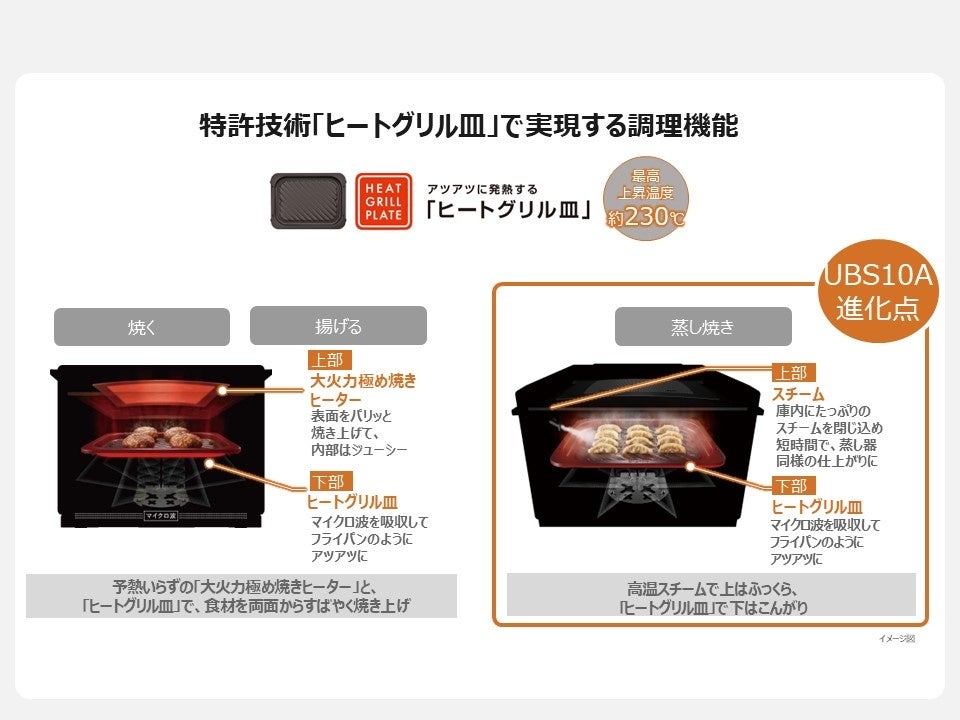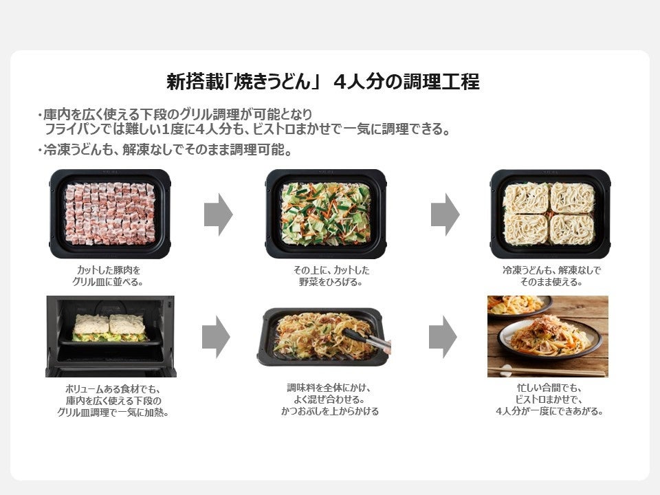 新製品NE-UBS10Aは、「ヒートグリル皿」とスチーム機能をかけ合わせ、冷凍食品を解凍なしでそのまま加熱できる「蒸し焼きメニュー」を新搭載しました。フライパンでは一度に調理しにくい4人分の麺や、ご飯の蒸し焼きメニューを一気に調理できます。