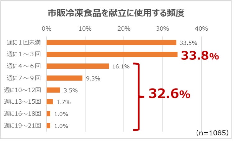 実際に、冷凍食品を献立に使用する頻度で最も多いのが「週に1~3回」で33.8%ですが、「週に4~6回以上」も32.6%という結果になりました。