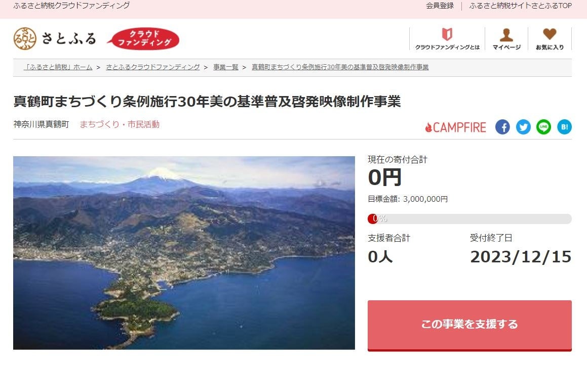 真鶴町は人口も少なく主だった産業もないため、事業を実施するにしても慢性的に財源が不足しています。各事業執行の際には、様々な補助金や交付金を活用しながら事業を実施しています。そこで、新たな試みとしてクラウドファンディングを活用し、美の基準普及啓発映像制作事業を実施したいと考えています。真鶴らしい風景を後世に残していくため、皆さまの温かいご協力・ご支援をお願いできないでしょうか。重ねてご協力のほどよろしくお願い申し上げます。