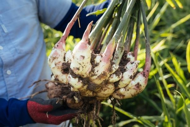 三陸の海が見える畑で、太陽の光とやませによって運ばれてくる海のミネラルをたっぷり浴びて元気いっぱいに育った香り高い生姜。農薬や化学肥料を使わず醤油のもろみかすを使用するなど、環境にもやさしく陸前高田の温暖な気候を活かした栽培方法で丁寧に育てられています。