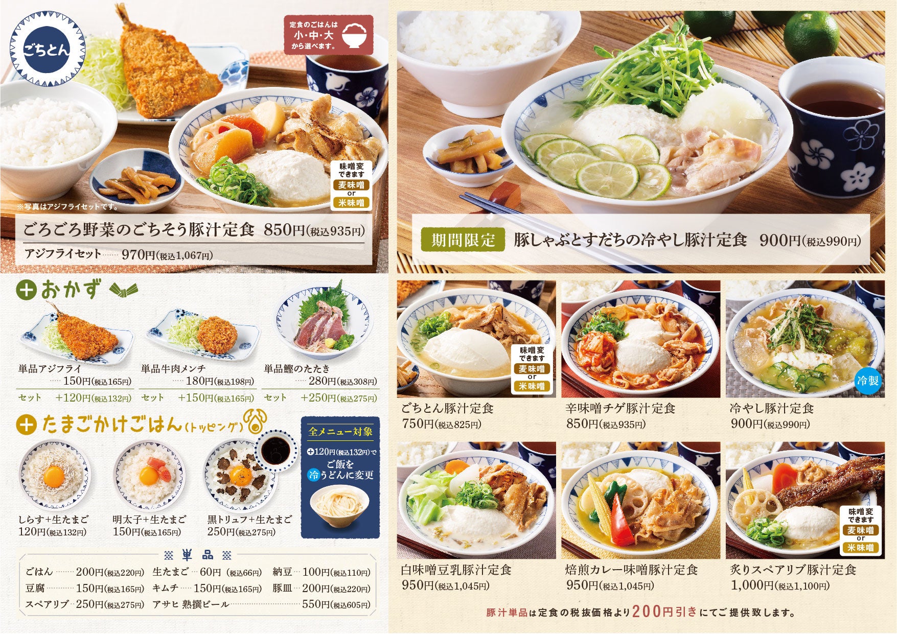 15時~21時まで、豚汁定食とご一緒に「アサヒプレミアム生ビール熟撰」が通常価格550円(税込605円)のところ、275円(税込302円)で販売いたします。