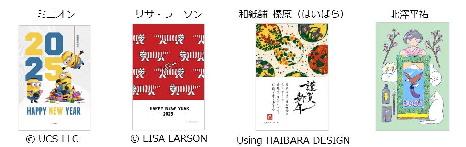 幅広いお客様から人気のアニメキャラクター「ミニオン」に加え、今年は新たに人気デザイナー「リサ・ラーソン」、東京 日本橋の和紙舗「和紙舗 榛原(はいばら)」、イラストレーター「北澤平祐」によるデザインコンテンツをご用意しました。1デザイン120円(税込)(注2)からダウンロードできます。デザインセット(注3)も5枚セット480円(税込)からご用意、一度購入いただければ何枚でも印刷して使えます。(注4)