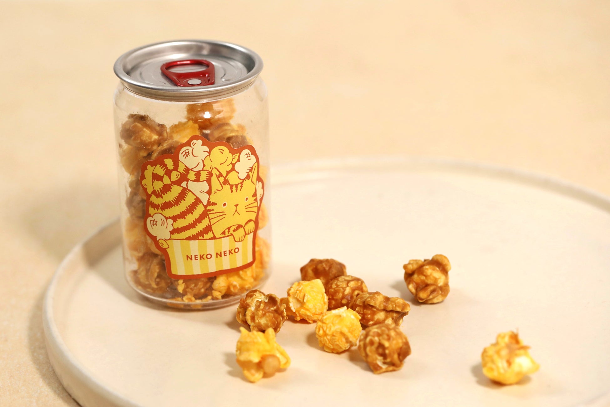 キャラメル味とチーズ味のポップコーンをアソートし、茶色と黄色のトラ柄のねこちゃんをイメージいたしました。 パッケージにも、かわいらしいトラ柄のねこちゃんのイラストが。