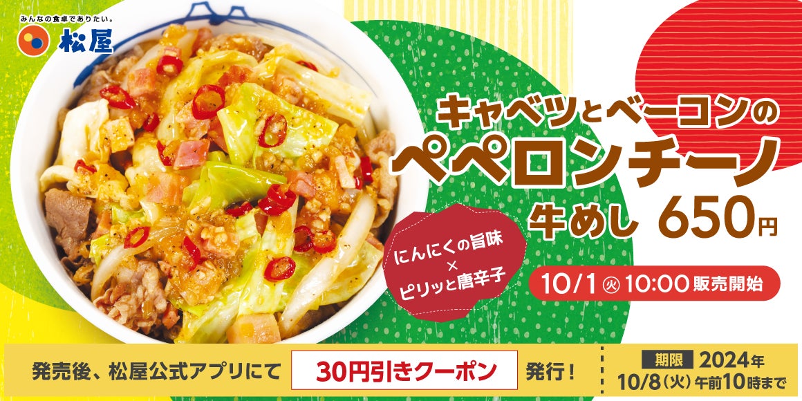 このたび松屋フーズ(本社:東京都武蔵野市、代表取締役社長:瓦葺一利)では、牛めし・カレー・定食・その他丼の「松屋」におきまして、2024年10月1日(火)10時より「キャベツとベーコンのペペロンチーノ牛めし」を販売いたします。