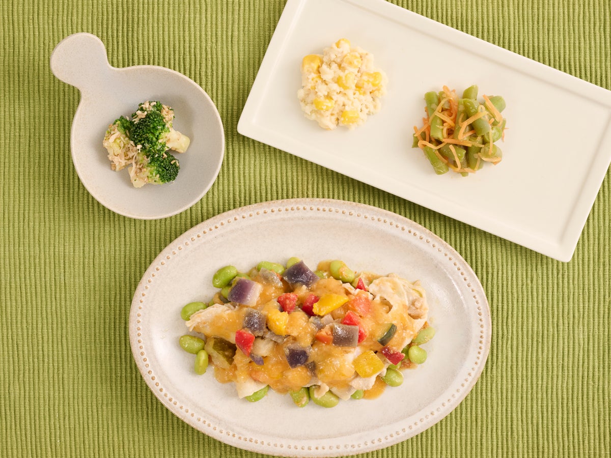 副菜は、香ばしいブロッコリーのごまサラダ、なめらかなポテトにコーンの甘味がアクセントのコーン入りポテトサラダ、シャキシャキ食感をお楽しみいただけるいんげんと人参ソテーです。