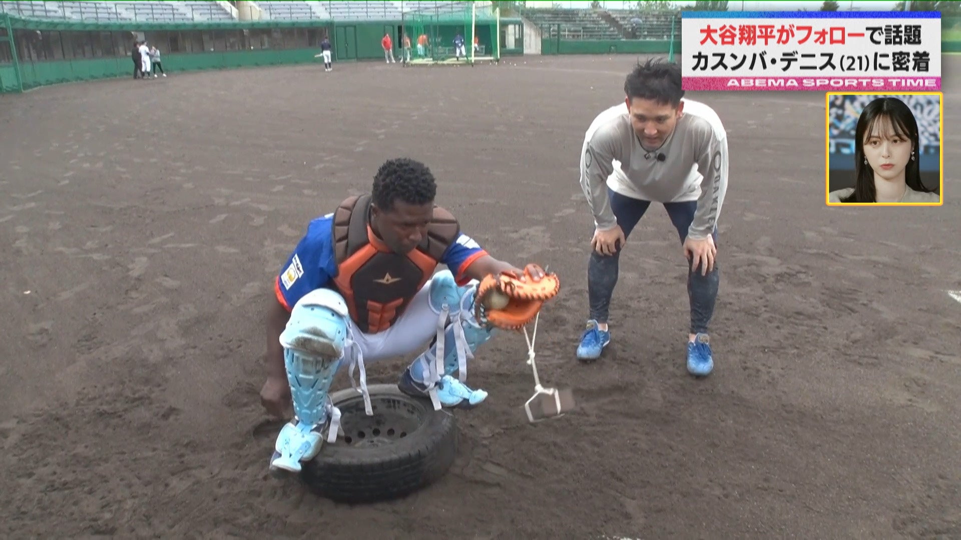 カスンバ選手の練習を見学すると、反響を呼んだ独自トレーニングを日本でも続けている姿が。タイヤの上に乗り、左手には2.5キロのレンガをぶら下げて行う捕球練習を杉谷さんも挑戦すると、「腕が疲れる!」と絶叫。そして、「しっかり腕を固定しないといけないから、フレーミングの技術向上にスゴく良い練習。理にかなっていると思います」とプロの視点から感想を語りました。