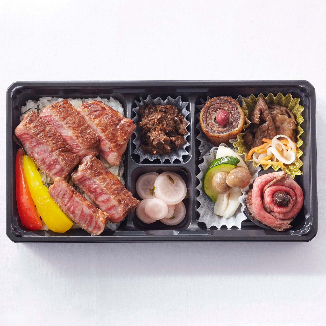 美味しい焼き色のステーキやバラの花に見立てた特製ローストビーフ、ロールカツや南蛮漬けなど、近江牛の老舗[毛利志満]の魅力を詰め込んだ特別な一折。