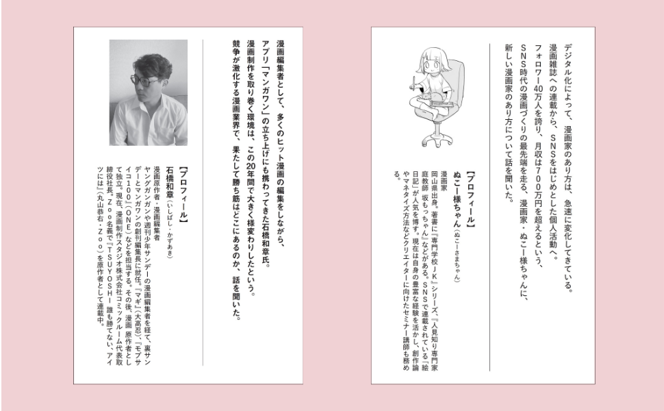 本書では、漫画業界の最前線の現場を知る2名の特別インタビューを収録。1人目は、漫画編集者として、『マギ』『モブサイコ100』など多くのヒット漫画の編集をしながら、アプリ「マンガワン」の立ち上げにも携わってきた石橋和章氏。2人目は、フォロワー40万人を誇り、月収は700万円を超えるという、SNS時代の漫画づくりの最先端を走る、漫画家・ぬこー様ちゃん。デジタル化やSNSの登場で大きく様変わりする漫画業界のリアルな状況について迫ります。