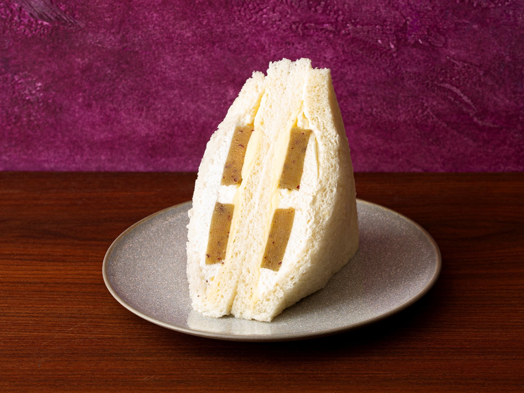 「鳴門金時本舗 栗尾商店」の芋羊羹を厚くカットし、自家製生クリームと練乳入りバターとともにサンド。皮も丸ごと加えて練った芋餡をそのまま固めた羊羹には、さつま芋の甘さと風味がたっぷり。芋羊羹とミルキーなコクのあるクリームが美味しい、新感覚のサンドイッチです。