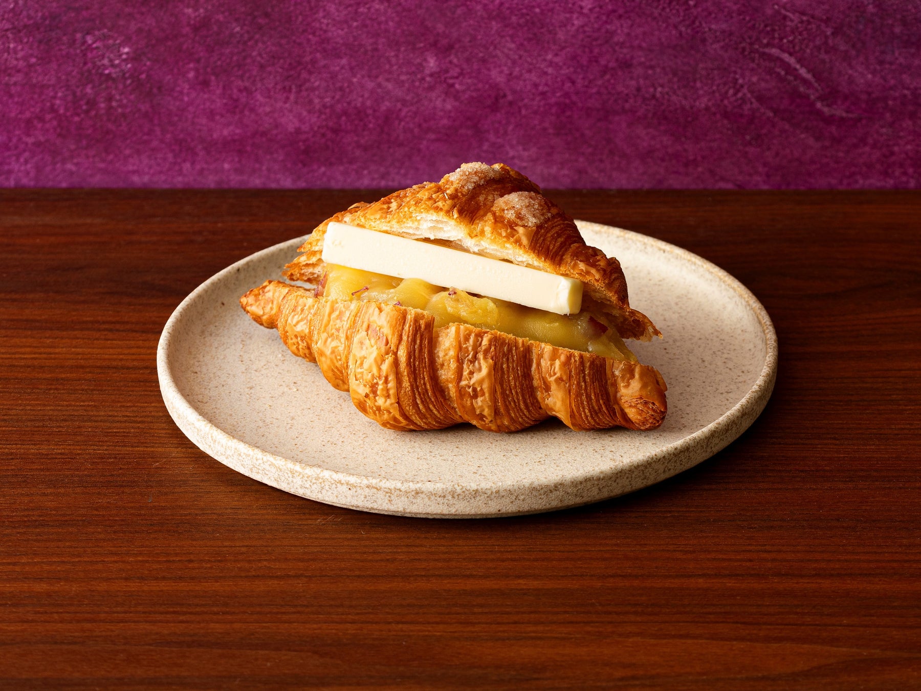 北海道産小麦を使った生地に高級発酵バターを折り込み、何層にも重ねて焼き上げたクロワッサン。その間に、さつま芋の優しい甘さを生かしたペーストと、スティック状のバターを挟みました。イートインで、でき立てサクサクをその場で味わうのもおすすめです。 ※数量限定:1日30個