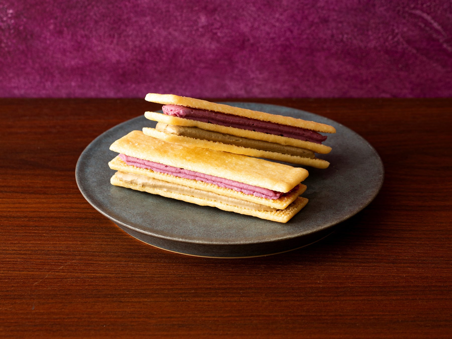 「KASA-NETA」シリーズは、バターが香るホロっとほどける食感のサブレと、口当たりなめらかな2種のバタークリームとの一体感がおいしい、スティック型のお菓子。秋にぴったりな季節フレーバーは、優しい甘さの紅芋と香ばしくほろ苦いほうじ茶の2層のクリームで登場。奥深い味わいを醸し、ワインのお供にもぴったり。