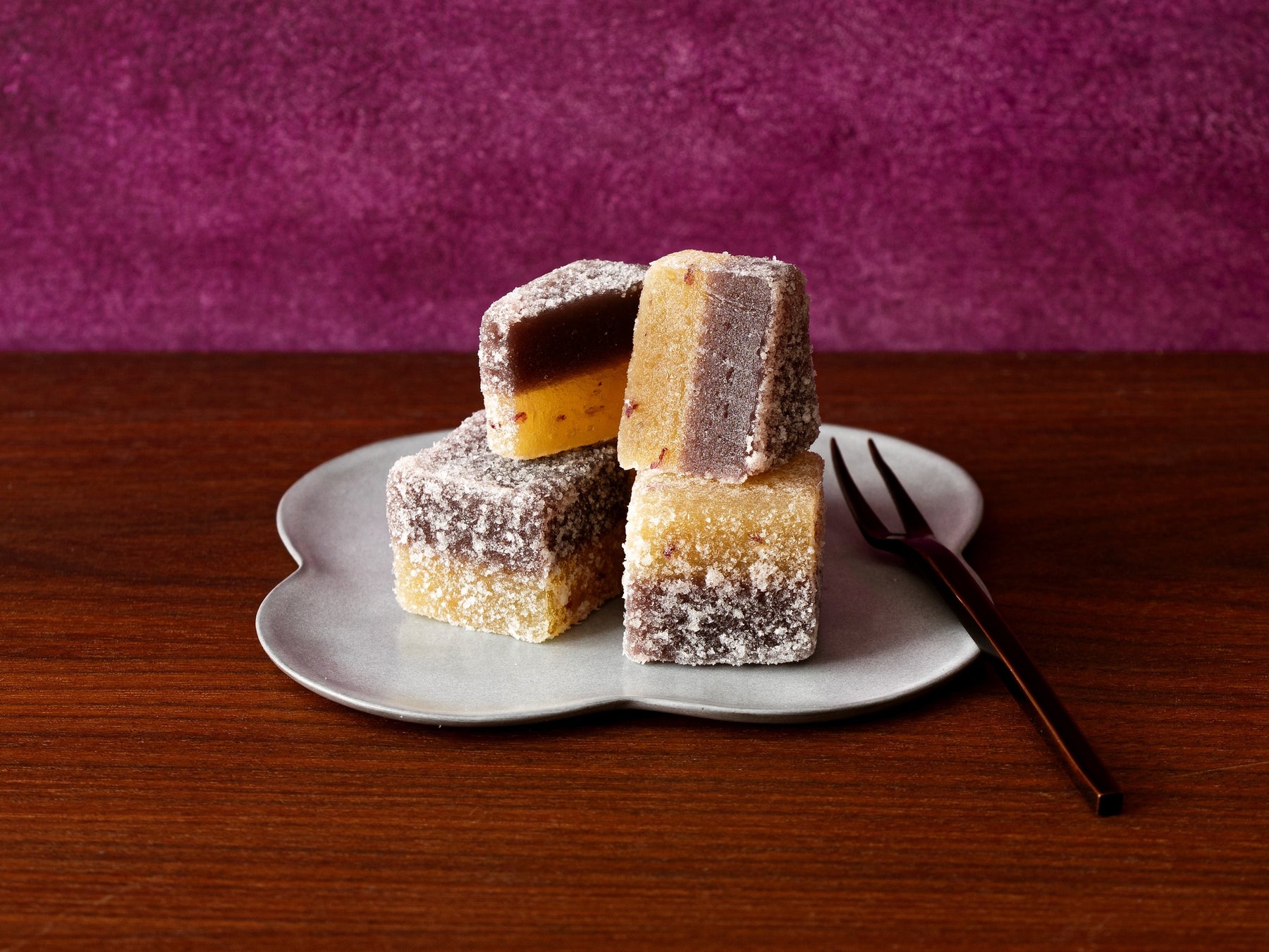 鳴門金時を使ったお菓子一筋の老舗が手がける、モチっとした食感が特徴的な創作系芋菓子。まるで石畳みのような独創的なスイーツは、鳴門金時を上品な甘さで仕上げた層と、コクのあるあんバターの層を組み合わせた、二層仕立てのキューブ型です。そのままで、または冷蔵庫で冷やしていただくのもおすすめです。