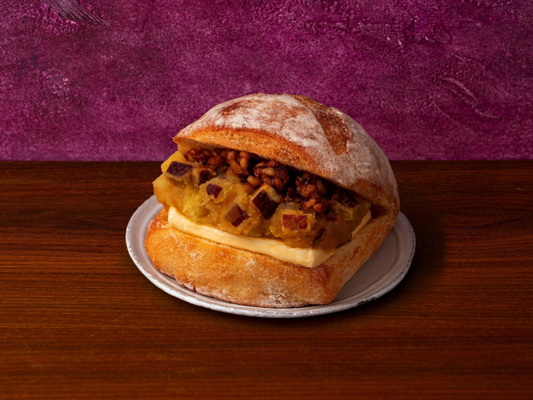 チーズを作った際に副産物として作られるホエイを100%使用したパンに、ペーストした「紅あずま」の焼き芋、キャラメリゼしたクルミ、発酵バターをサンドしました。口の中でいくつものマリアージュが楽しめます。※数量限定:1日50個
