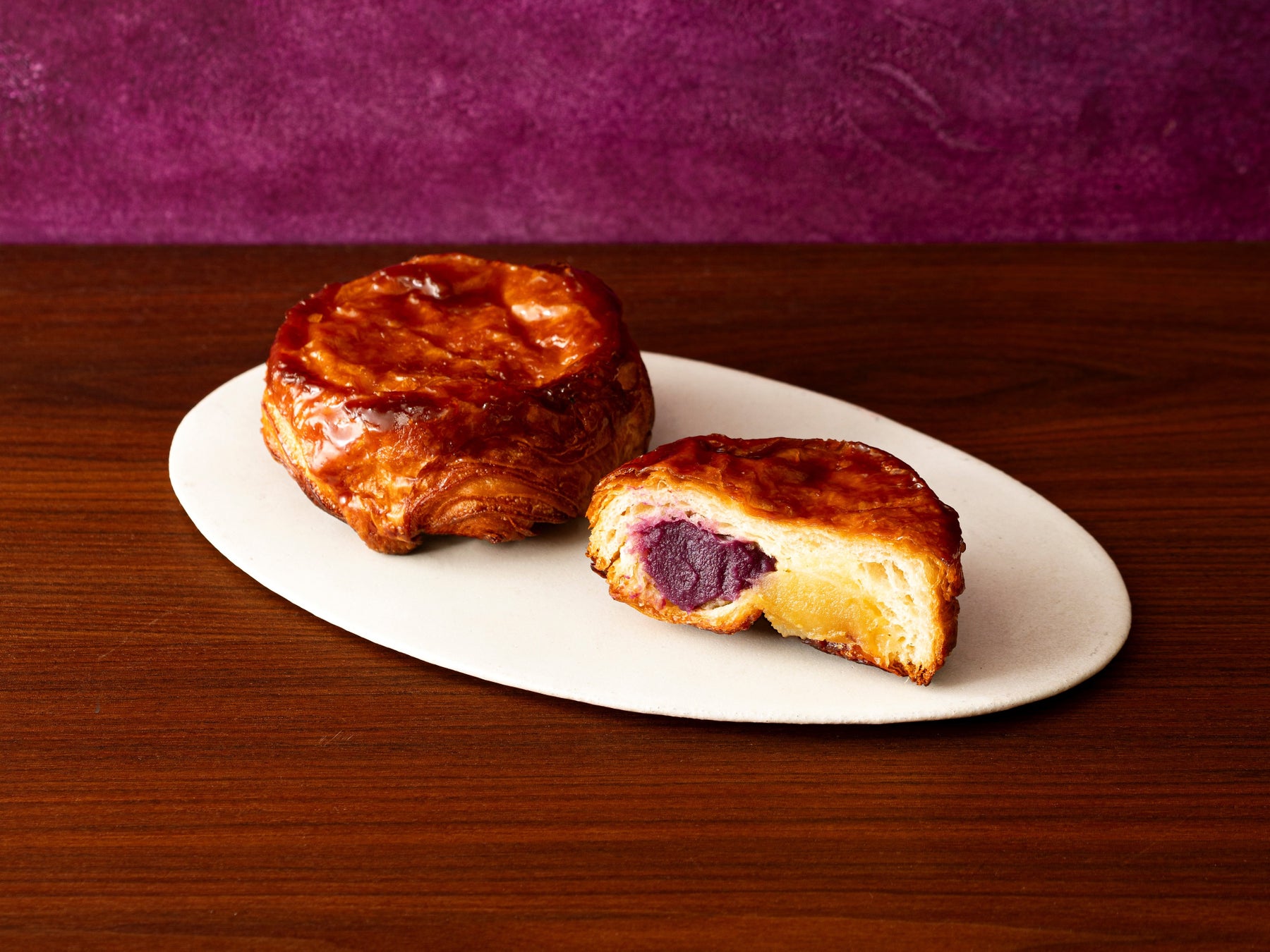 ほくほく食感の「紅はるか」のフィリングと、滑らかに仕上げた「紫芋」のスイートポテトを包みました。サクサクに焼き上げたクイニーアマンは、バターをたっぷり折り込んだ生地をキャラメリゼ。外側は、固めの食感、中はお芋のしっとり感をお楽しみいただけます。お芋とバターのハーモニーを存分にどうぞ。※数量限定:1日20~30個