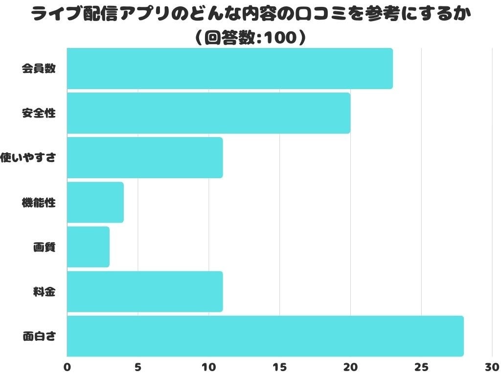 ライブ配信アプリのどんな内容の口コミを参考にするかをアンケートにて調査したところ、1位は「面白さ」でした。