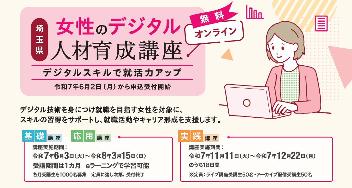 埼玉県女性キャリアセンターでは、出産・子育てで離職している女性やキャリアチェンジを目指している女性を対象に、オンラインによる「女性のデジタル人材育成講座」を開催します。