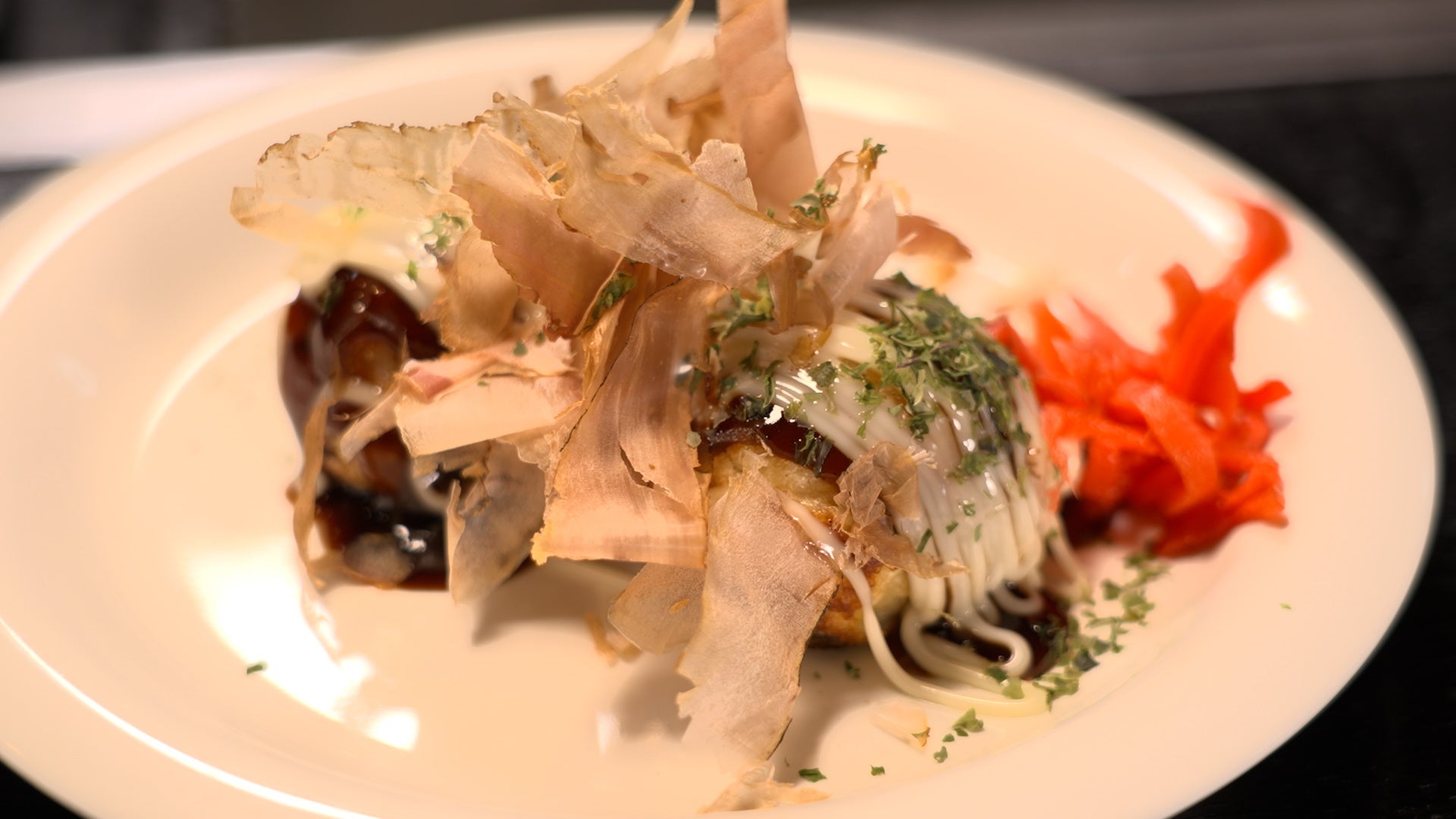 テーブルには、たこ焼き用の鉄板も。できたて熱々な状態のたこ焼きは絶品だ。