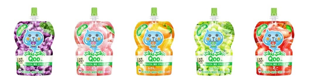 また、「ぷるんぷるんQoo」も、「ぶどう」「もも」「みかん」「マスカット」「りんご」の5フレーバーを果実感があふれる新デザインに刷新。さらに、今回新たに管理栄養士の推奨※1を受けアイコンを追加したほか、栄養素や合成着色料・保存料不使用の表記をこれまで以上に強調しています。管理栄養士推奨のおやつとして、これまで以上に安心感を提供するゼリー飲料となりました。