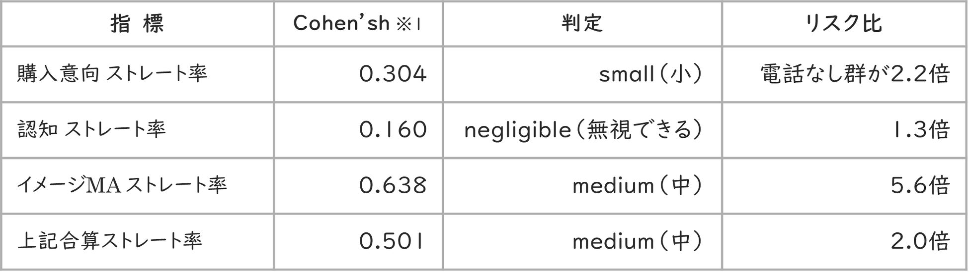 6つの品質指標のうち、イメージMA・合算ストレート率・平均反応個数・回答時間の4指標については、統計的な有意差にとどまらず、差の大きさとしても実務上の意味がある水準であることが確認されました。