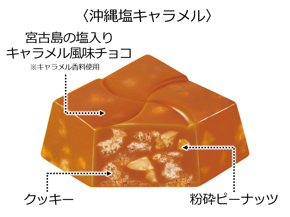 香ばしいローストピーナッツやザクザク食感のクッキーがキャラメル風味チョコと相性抜群。ミルキーなキャラメルの味わいに、宮古島の塩がアクセントになっています。