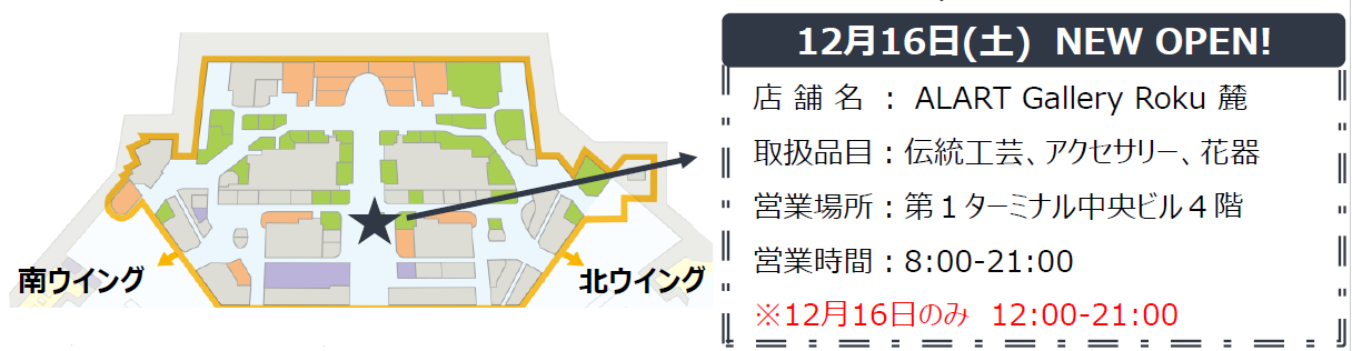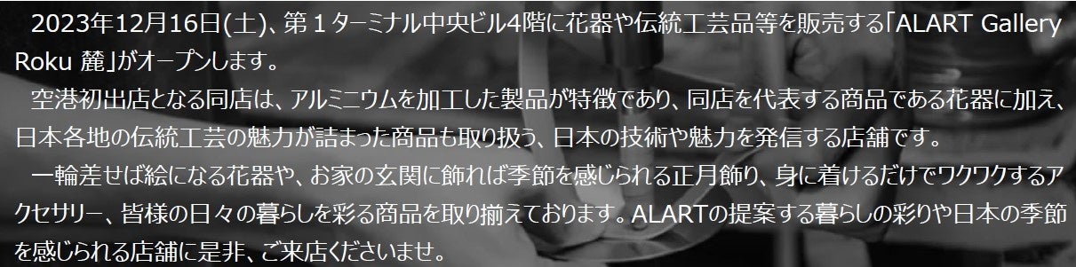 空港初出店!暮らしの彩りを提案するショップ「ALART Gallery Roku 麓」が12月16日にオープン!成田国際空港株式会社2023年12月14日 14時00分いいね!数を読み込み中です 取扱い商材イメージ(一部) LETTERS(ピアス) 16,500円~ UTAKATA(花器) 2,750円~ Signage(ランチョンマット) 4,950円~ すべての画像種類商品サービスビジネスカテゴリインテリア・家具・収納広告・宣伝・PRキーワード成田空港空港初出店ALART Gallery Roku 麓12月16日オープン第1ターミナル中央ビル4階花器伝統工芸品等アルミニウム加工関連リンクhttps://www.naa.jp/jp/ダウンロードプレスリリース素材このプレスリリース内で使われている画像ファイルがダウンロードできます