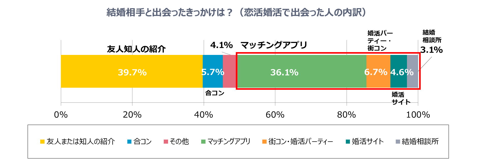 1位は「マッチングアプリ」で25.5%、2位は「友人または知人の紹介」で20.9%、3位は「合コン」で17.3%でした。