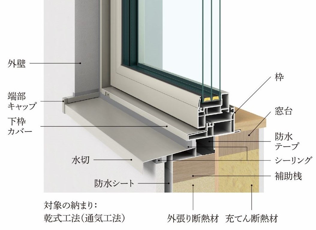 断熱等級6・7を目指すには付加断熱工法(※5)が必要で、窓の納め方は「インセット納まり」と「アウトセット納まり」があります。インセット納まりには水切が必要ですが、板金等で現場ごとに対応しているところが多く、施工性や水密性などの課題がありました。そこで今回オプション部材として新たに水切を設定。補助桟に取り付ける仕様のため施工性が向上しています。水切の出幅は90mmと120mmの2種類があり50~100mmの外張り断熱材に対応可能です。インセット納まりは、窓の取付位置が室内側にあるので、外気温の影響を受けにくく、窓表面の温度が室温に近づくため、コールドドラフト現象(※7)や結露の抑制にも効果的です。また、意匠性の面でも窓に陰影のある外観デザインが実現できます。カラーバリエーションは窓本体の外観色に合わせた4色展開です。