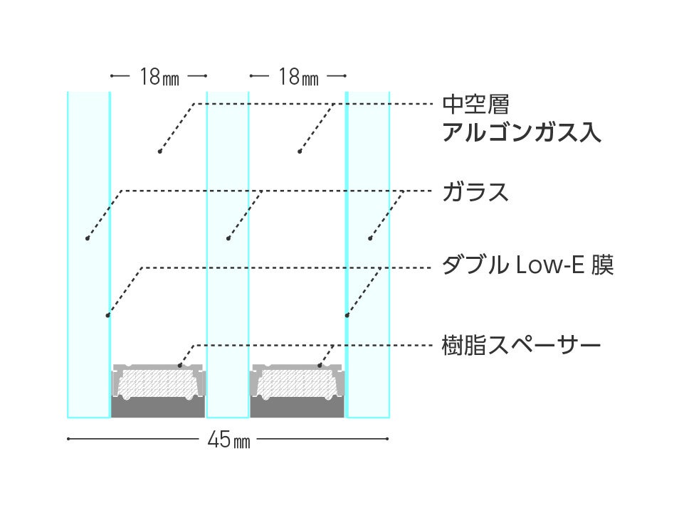 ダブルLow-Eトリプルガラス・アルゴンガス入(ブルー、ブロンズ、ニュートラル、クリア) |