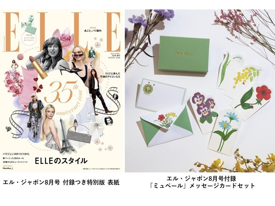 創刊35周年を記念して発売される『エル・ジャポン』8月号「ミュベール」メッセージカードつき特別版。「ミュベール」デザイナーの中山路子さんが書き下ろしたフラワーモチーフがかわいいメッセージカードとミニ封筒に。カードとミニ封筒が収納できるオリジナルボックスは、「ミュベール」のロゴを箔押しした高級感のあるデザインです。「ミュベール」の名前の由来にもなっているスズラン(ミュゲ)をはじめとする全5種のメッセージカードは、日ごろお世話になっている友人や、大切なひとに感謝の気持ちを伝えるときにもぴったりのアイテム。