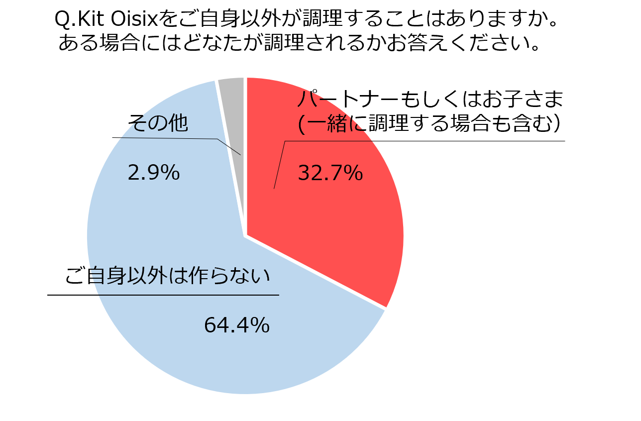 今年4月に実施したお客様向けアンケート(※2 調査概要は後述)で「Kit Oisix(ミールキット)をご自身以外が調理することはありますか。ある場合にはどなたが調理されるかお答えください」と質問したところ、「パートナー」もしくは「お子さま(一緒に調理するも含む)」と回答した方は32.7%にのぼりました。手順が写真付きで説明されており、材料が揃っているため、細かく説明せずに任せられる、という点がその理由のようです。