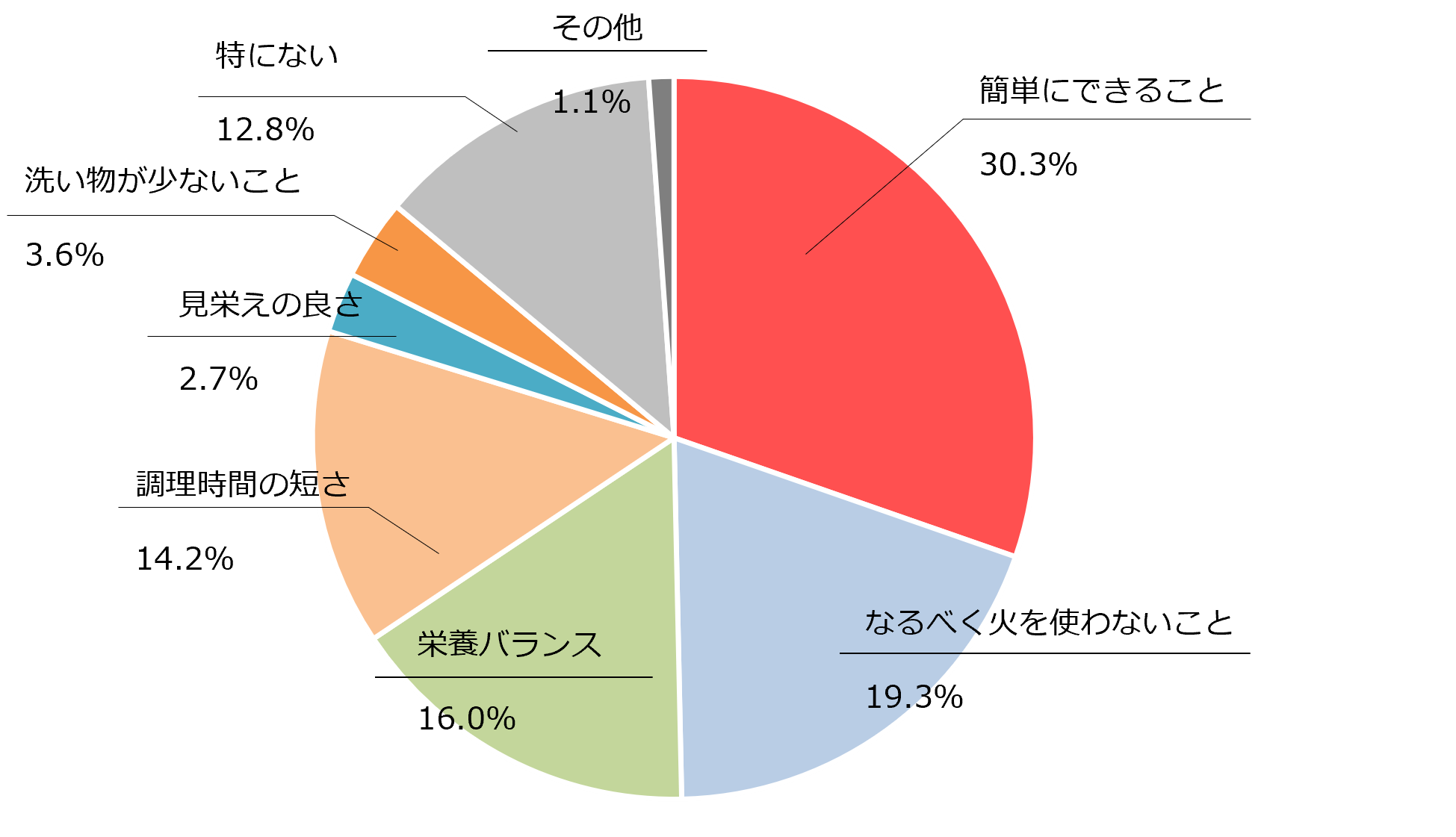 料理をするとキッチン内の室温が上昇することから、なるべく簡単な調理で済ませたい、という傾向が強まります。そこで、当社は20代~50代のお子さまがいる全国の男女500名を対象に「夏に料理をする上で、最も重要視することはなんですか」というアンケートを実施したところ、「簡単にできること」が最も多く、30.3%の方が回答しました(※1 グラフおよび調査概要は後述)。