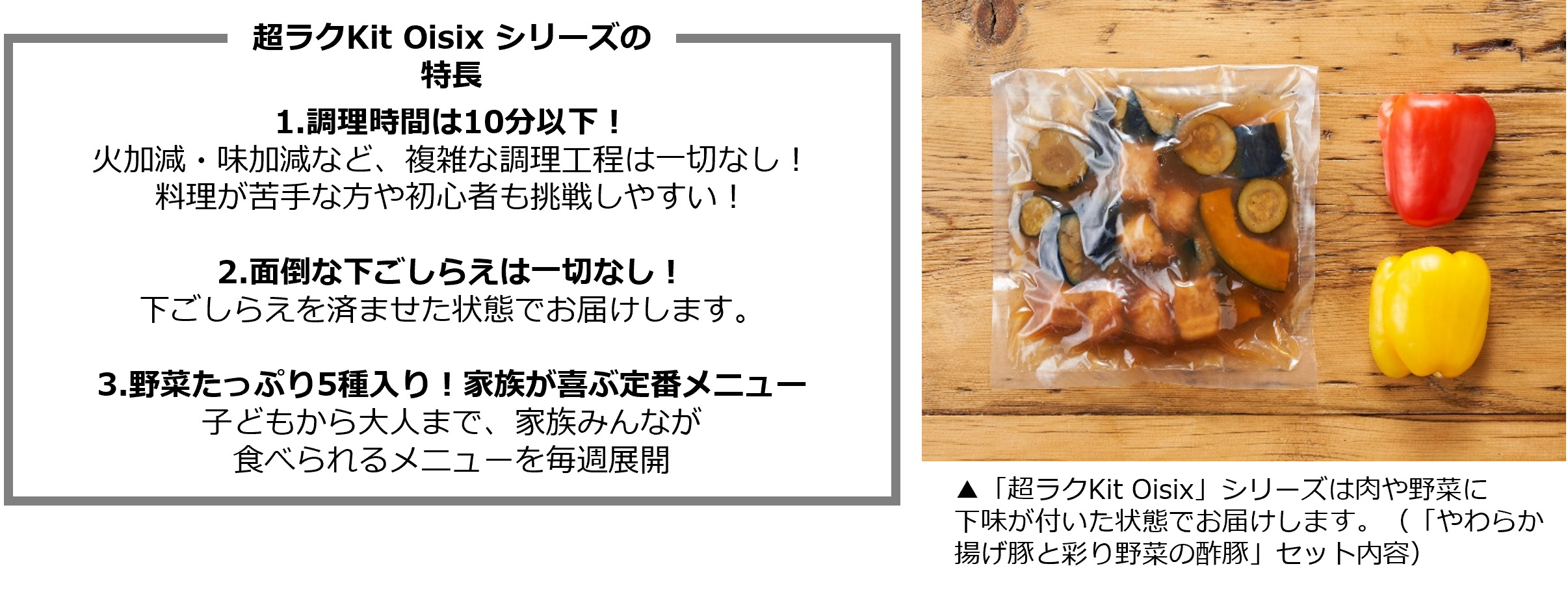 「超ラクKit Oisix」シリーズは、下味が付いた肉や、カット済みの野菜を採用することで、調理工程を単純化することに重点を置いて設計しています。